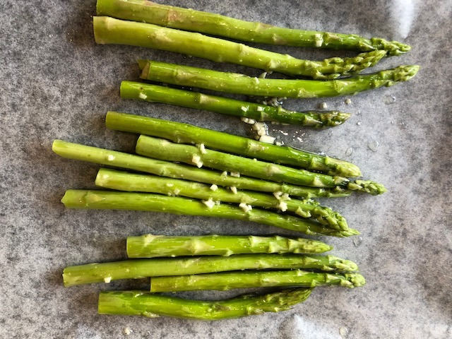 Place the asparagus stalks on a baking tray and drizzle them with extra virgin olive oil, 1/2 tsp pink himalayan salt and minced garlic