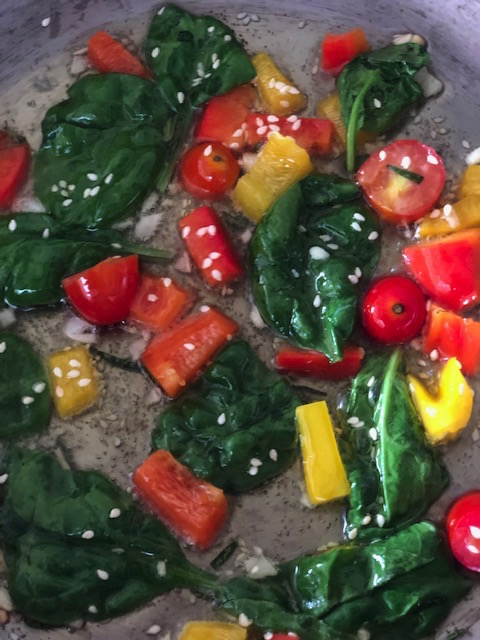 Peppers, rosemary and tomatoes sautéd with garlic in olive oil Spinach, peppers, tomatoes, rosemary and sesame seeds sautéed in olive oil and garlic Eggs beaten till bubbles form Frittata fluffing in the oven