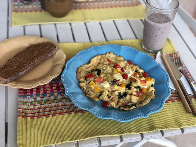 Not only does the frittata ensure adequate consumption of vegetables, but also good fats in the omega 3 oils (e.g. olive oil or avocado oil) that one can use to cook them, and the seeds with which one can adorn them (e.g. sesame seeds). Finally, the frittata might also be accompanied by a slice of toasted sourdough bread with almond butter.