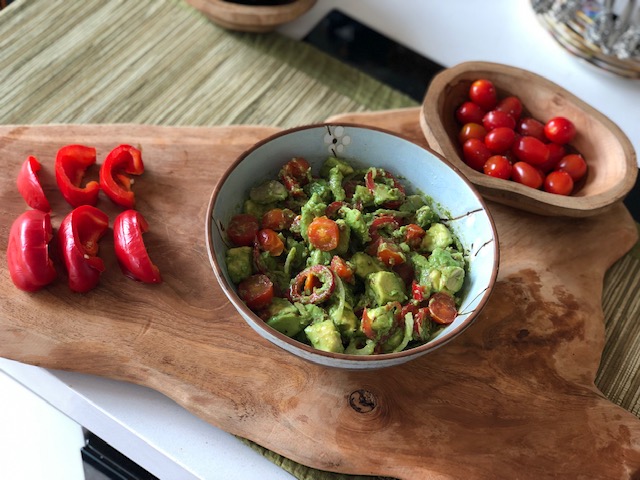 In addition avocados are high in monounsaturated fats which are a ‘good fat’ that help reduce the risk of heart disease. These good fats also help the body absorb fat-soluble essential vitamins like A, D, E and K, so avocados if eaten with a variety of vegetables can enable these vitamins present in them to get efficiently absorbed by our bodies. In this recipe I have used bell peppers as they are rich in Vitamins A, E and K. And the cherry tomatoes have abundant Vitamins A and K as well. So, the good fats present in Avocados enable our bodies to absorb these vitamins optimally.