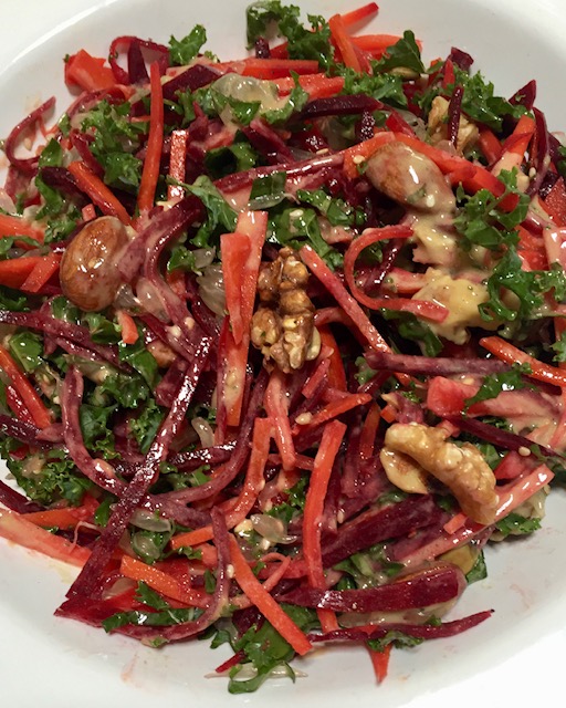 The beetroot, carrots and red cabbage should be thinly sliced and the kale should be chopped into small pieces.