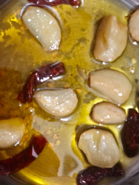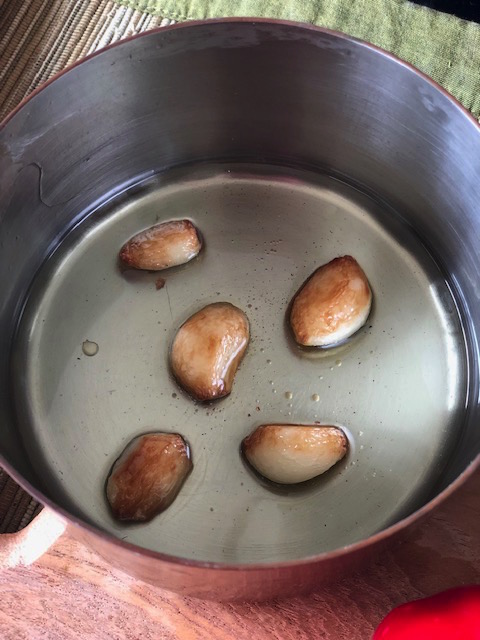 4. Warm the 5 pods of garlic in the 2 tbsp of olive oil on low fire until they are brown