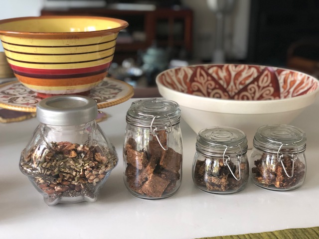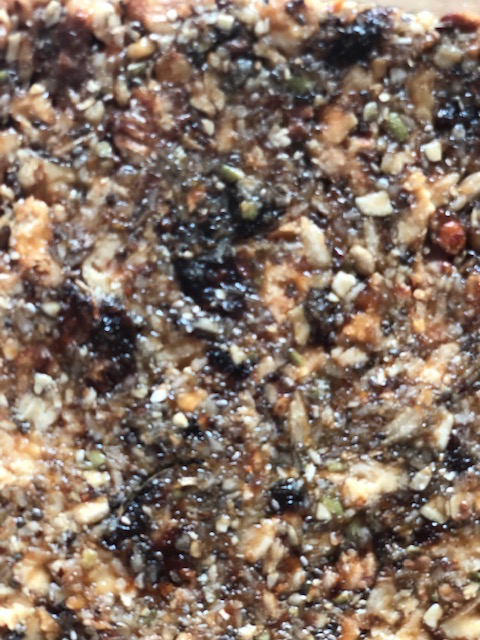 Walnuts, seeds, apricots, coconut flakes and maple syrup compressed in a dish