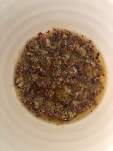 2. Mix the cumin seed powder, red chilli flakes, whole grain mustard, olive oil, sea salt and garlic