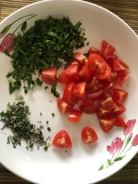 9. Smash the cooked garlics and mix into the tomato salsa