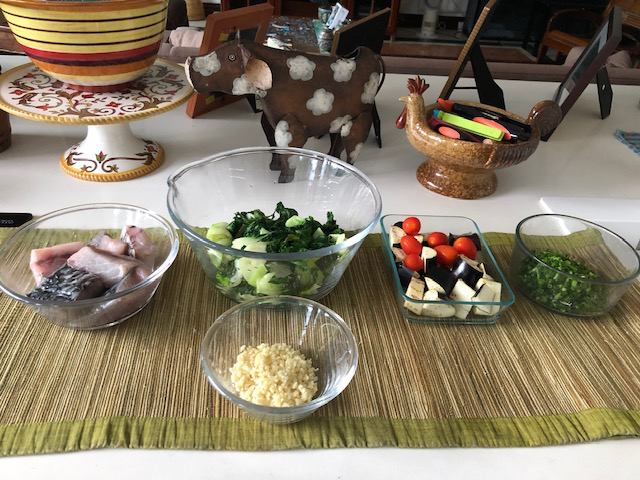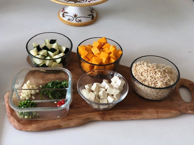 Prep – chilli pepper, red chilli padi, garlic, onion, parsley, tofu, brown rice, pumpkin and zucchini