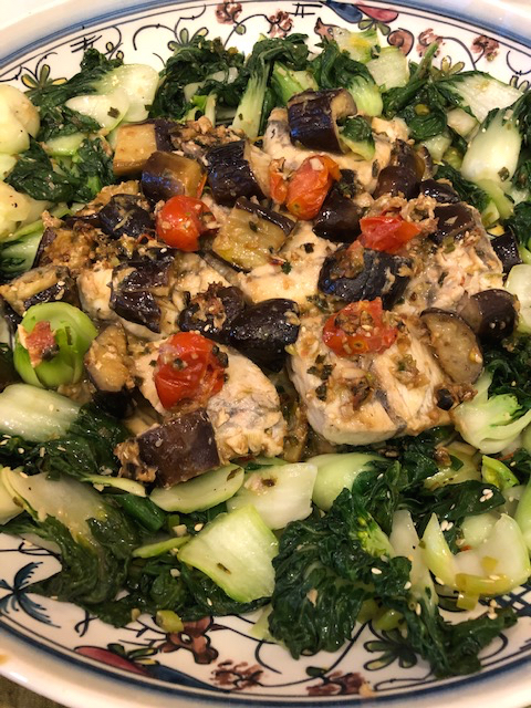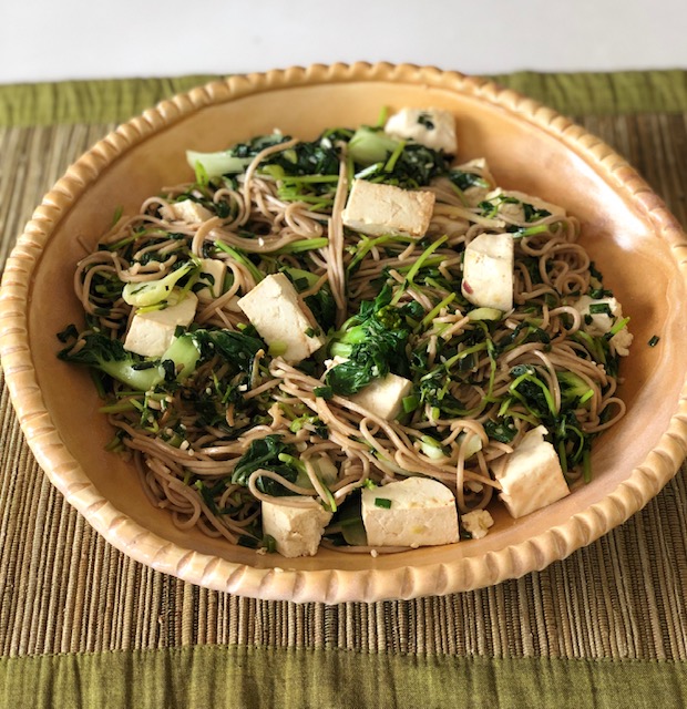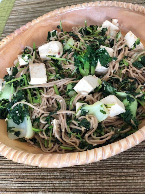 The noodles in this dish are made of whole wheat flour and dried Kombu and Kelp sea vegetables. Both of which are high in fiber and sugars that are food or prebiotics that nourish our gut microbiome. The Wakame seaweed added to the dish is also a prebiotic but, in addition like Kombu and Kelp is high in iodine, magnesium, folate, manganese and calcium. These trace elements are essential for ensuring a healthy thyroid function, heart health and for reducing insulin levels in the body.