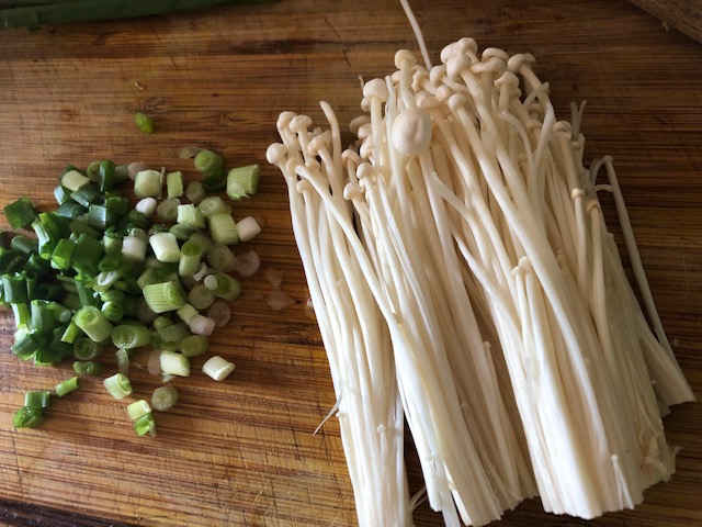 2. Slice off the bottom of the Enoki mushrooms and separate them into smaller bunches