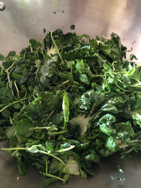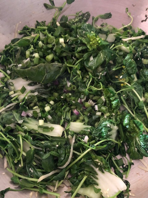 Dou Miao pronounced as ‘dough+meow’ are the curly tendrils of pea plants (mostly snow or snap peas) and are used in Chinese and other Asian cuisines. They can be sautéed with garlic or even eaten raw in some salads. Dou Miao has three anti cancer agents : folate, antioxidants and carotene as well as protein.