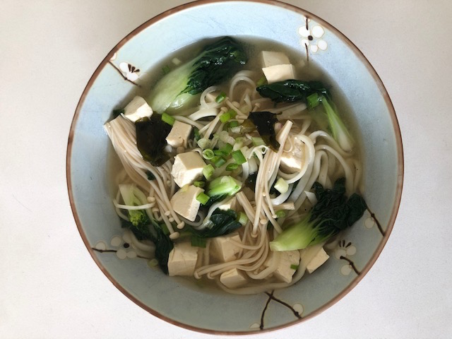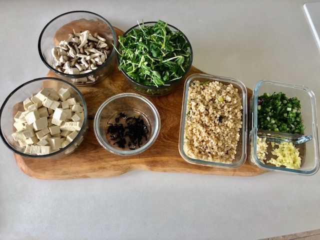 This is a complete meal for a vegetarian, as it has a good serving of protein obtained largely from the tofu and Dou Miao. The Wakame seaweed adds flavour and infuses it with some more minerals.
