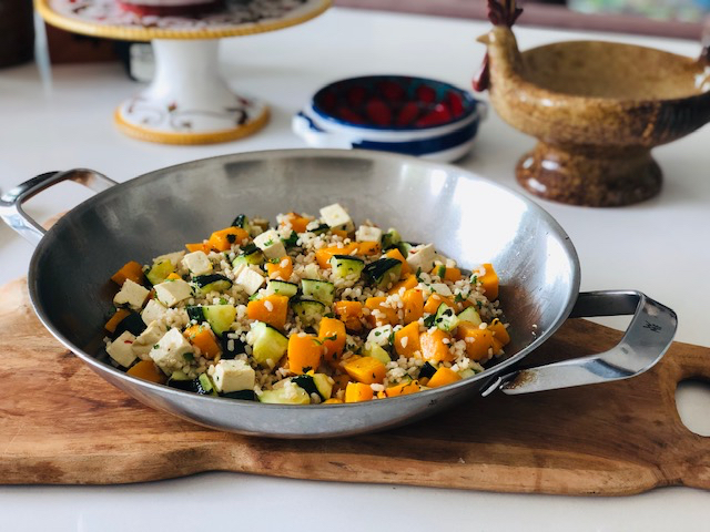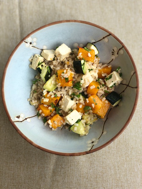 This rice bowl is nutrient dense with plenty zucchini, pumpkin, tofu and brown rice. It has a high fiber content and therefore a great meal to add to your diet as fiber is known to help lower blood pressure, reduce the risk of heart disease and stroke. In addition Zucchini is rich in antioxidants and anti-inflammatory phytonutrients, that help rid the body of free radicals and low lying inflammation. It is also great for healthy digestion as it has a high amount of water, fiber and electrolytes. Pumpkin in addition to it’s polysaccharide fibers, has several nutrients like the carotenoids, vitamin C, and minerals such as potassium and magnesium which have been researched for their role in health and chronic disease prevention. Pumpkin has been used in some cultures as a medicinal plant to treat diabetes, high blood pressure, high cholesterol, and inflammation. Other than it’s nutritious value this dish is satiating and a complete meal. I have purposely cubed the vegetables so that they give bulk to the meal.